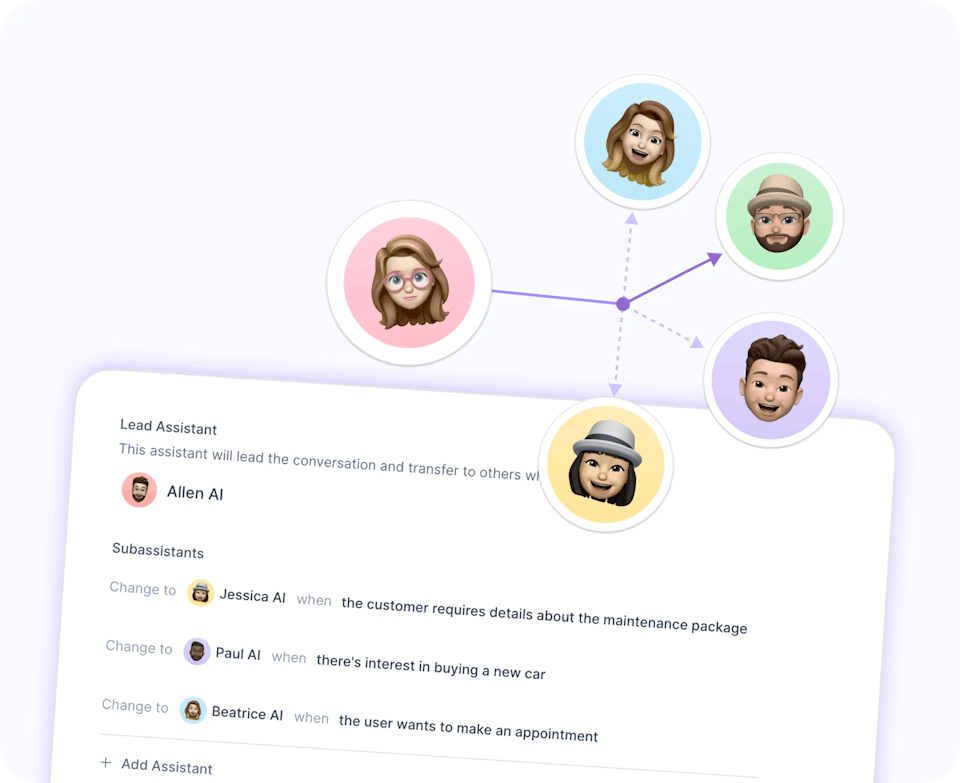 Build teams of AI phone Assistants that share one phone number, replacing traditional IVR systems with advanced engaging interactions.